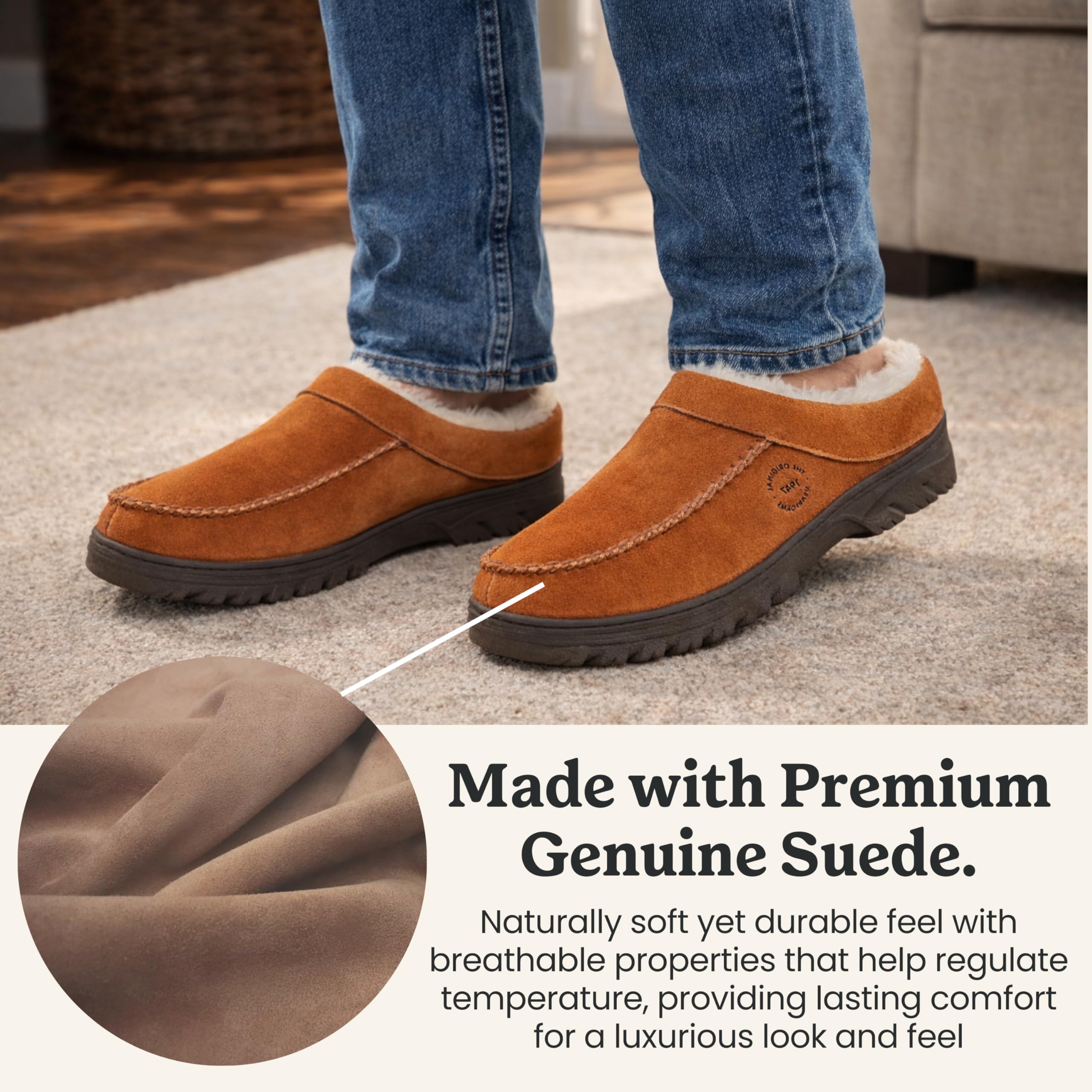 - CONTEMPORARY STYLE & TIMELESS QUALITY: 70 years and a billion pairs later, Dearfoams continues to provide exceptional quality and style in every pair. Dearfoams Men's Reed Genuine Suede Clog slipper is no exception - these are sure to be your new everyday favorite!
