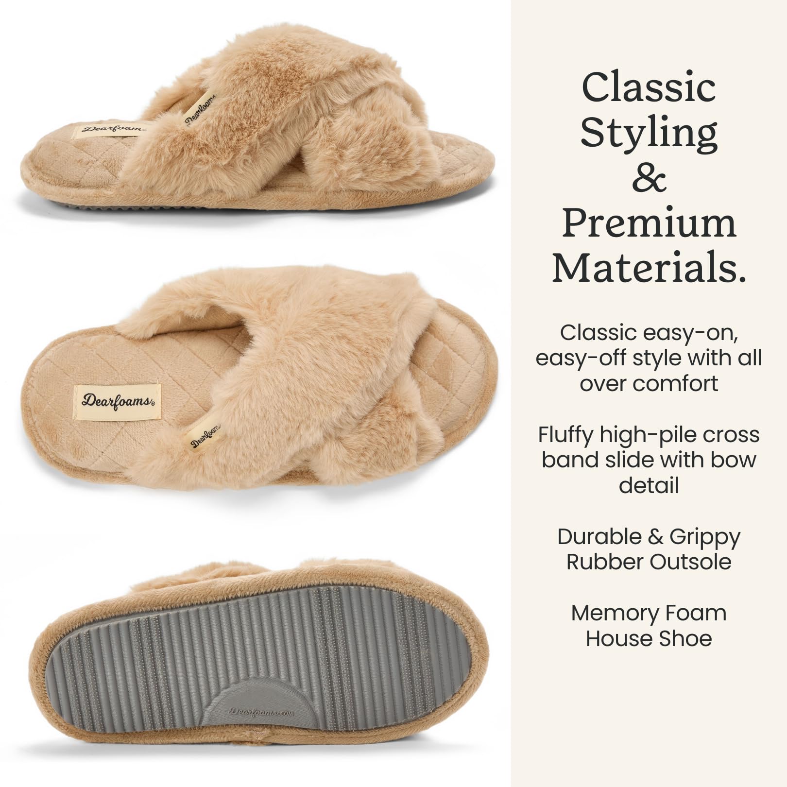 - SLIDE-ON DESIGN: Dearfoams Women’s Jessica Plush Crisscross Slippers are perfect to slide on when you are looking for some extra comfort for your well-deserving feet. These everyday slippers will be your new favorite.