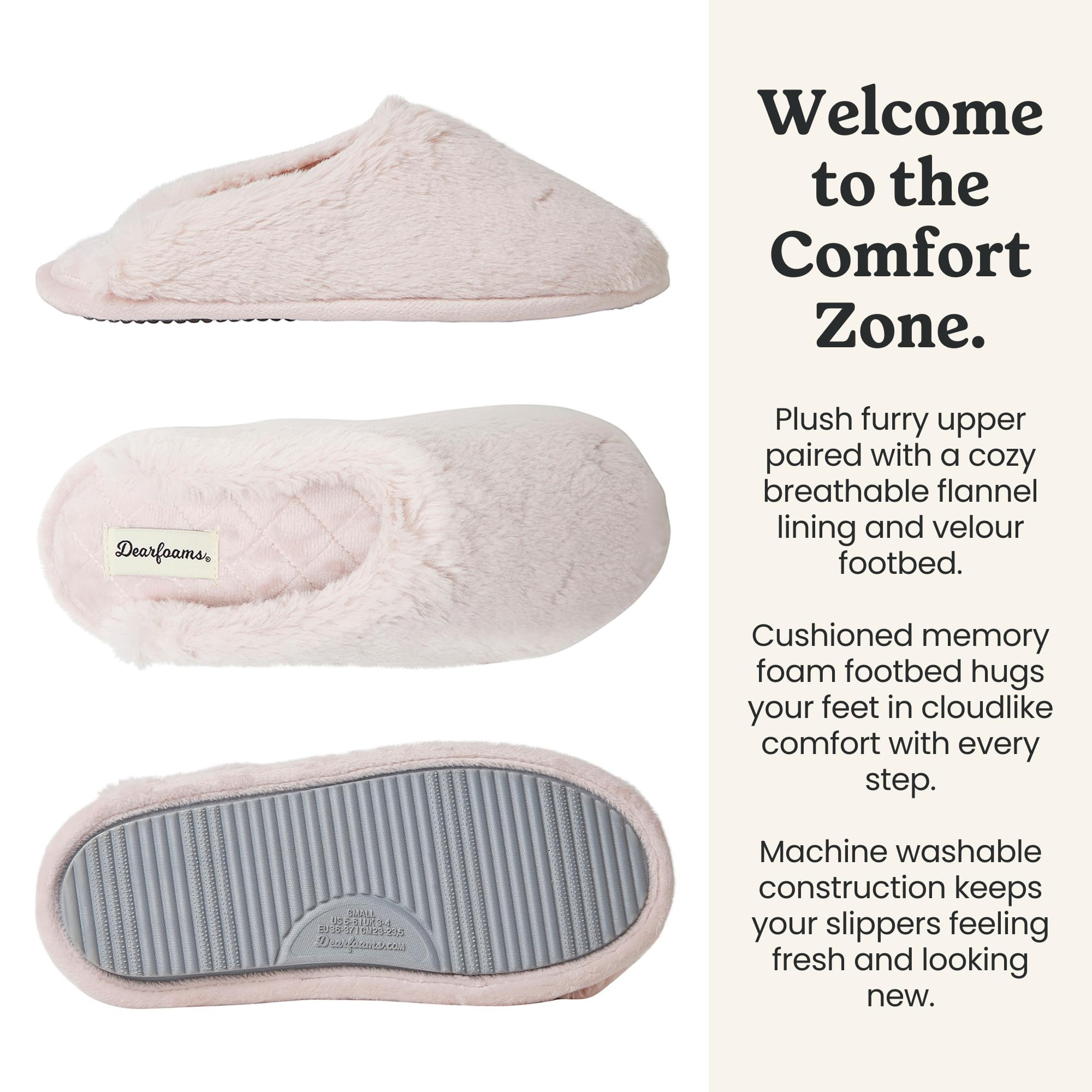 - SLIDE-ON DESIGN: Dearfoams Women’s Bailey Plush faux faux fur Scuff Slippers are perfect to slide on when you are looking for some extra comfort for your well-deserving feet. These everyday slippers will be your new favorite.