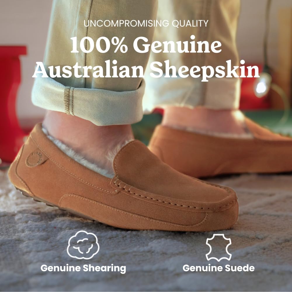 Fireside by Dearfoams, Melbourne Genuine Shearling Moccasin Slipper (10) Chestnut